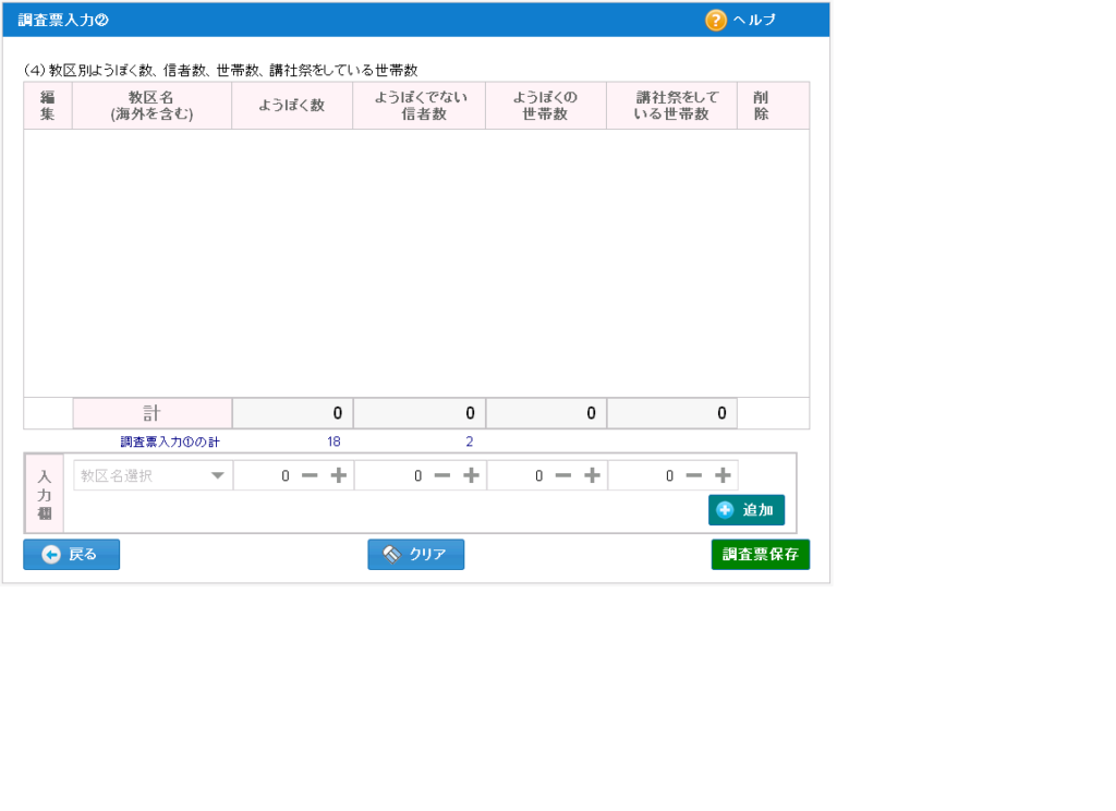 入力欄で教区を選択後、教区毎のようぼく数、ようぼくでない信者数、ようぼくの世帯数、講社祭をしている世帯数の入力をお願いします。