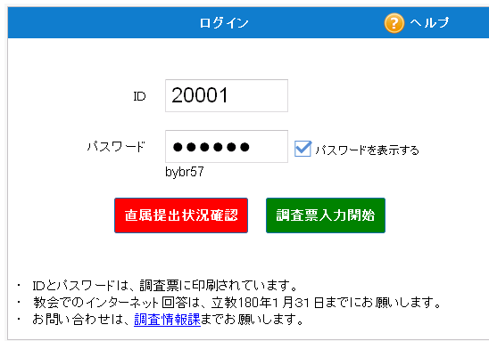 ログイン画面にて、ログイン情報(ID、パスワード)を入力し「調査票入力開始」を押してください。