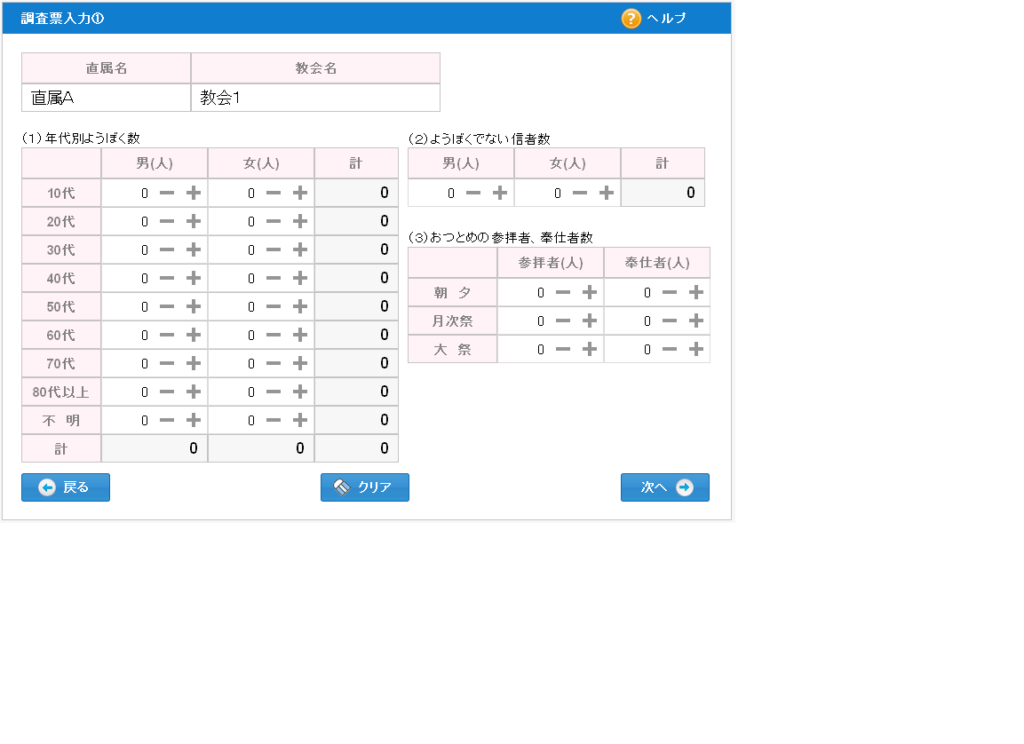 年代別ようぼく数、ようぼくでない信者数、おつとめの参拝者、奉仕者数の入力をお願いします。